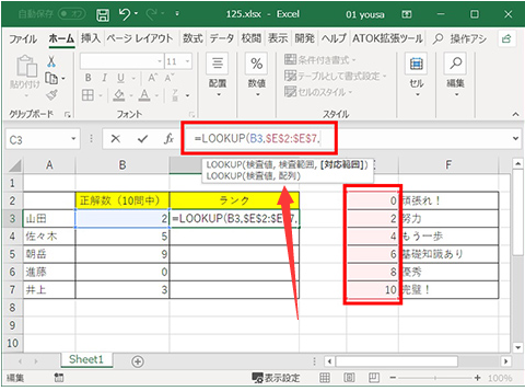 今回はD5番地が何行目なのかを調べたいわけですから、それを当てはめると、このような数式になります。
