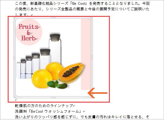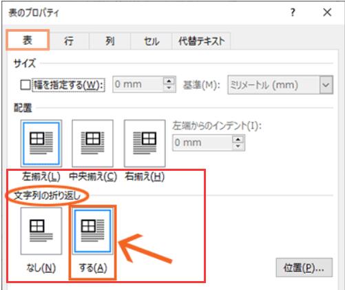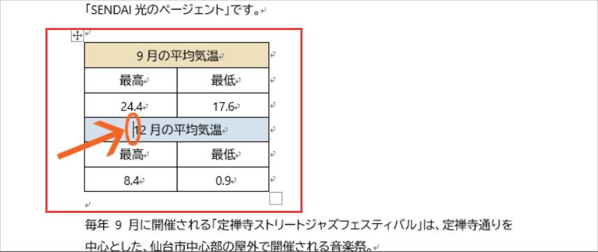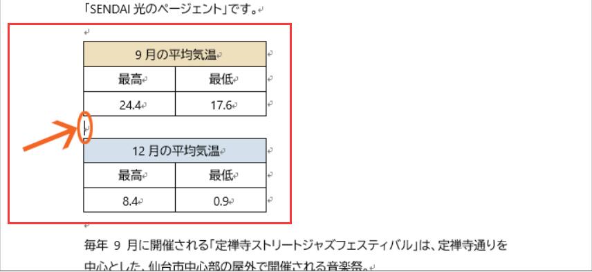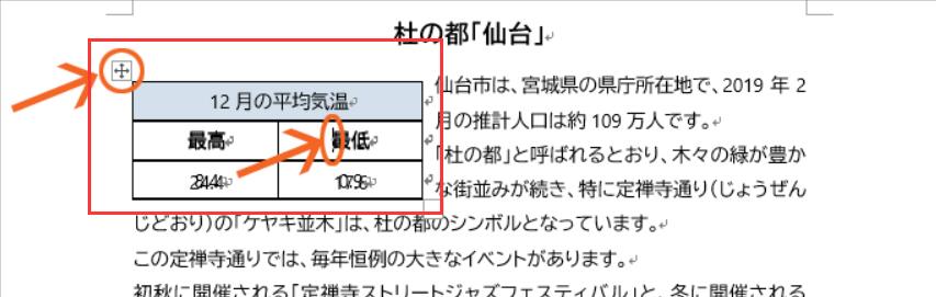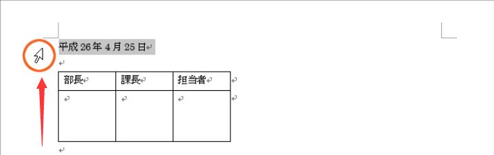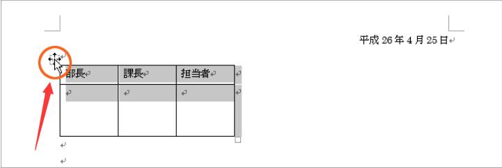 でも、表全体を選択している時には、表全体の位置を変えることができるので、下の図のように表全体を選択し、