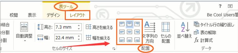 word表内の文字の位置を整えるには、位置を整えたい文字が入っているセルを選択後、[表ツール]の[レイアウト]タブ、[配置]グループにある、下の図の9つのボタンを使えばOKでした。