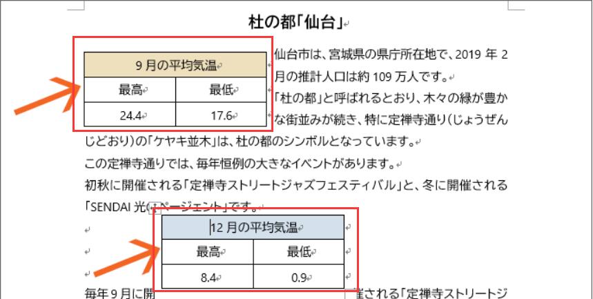 表を上下に分割するには、ここから2つ目の表にしたいという、先頭のセルに文字カーソルを置き、